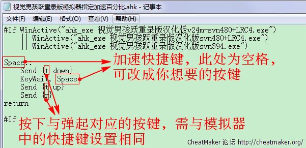 视觉男孩跃模拟器自带的加速功能(指默认快捷键为按住空格的全速功能)速度过快,而用设置速度百分比的方法又不方便,于是我研究出新方法,可实现较精准的控速,且加速方式仍为原来的全速单一快捷键,即按下快捷键加速、弹起快捷键恢复正常速。