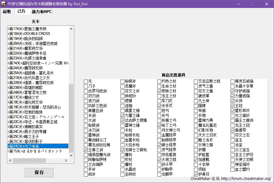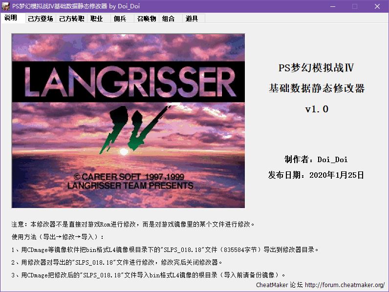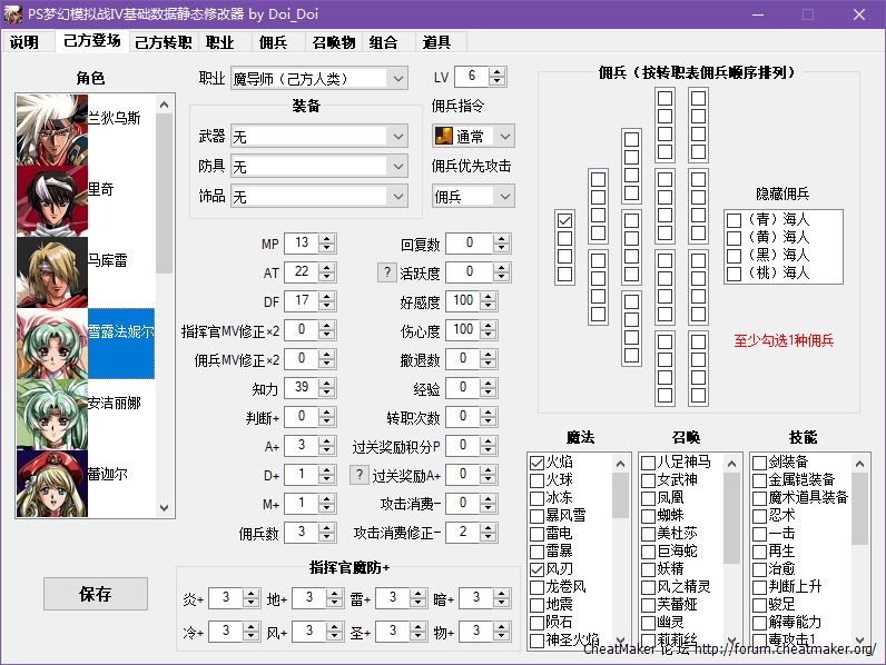 本修改器能修改PS梦幻模拟战Ⅳ己方登场和转职表、全职业、全佣兵、全召唤物、全道具、全关卡商店和敌方配置等数据。