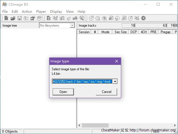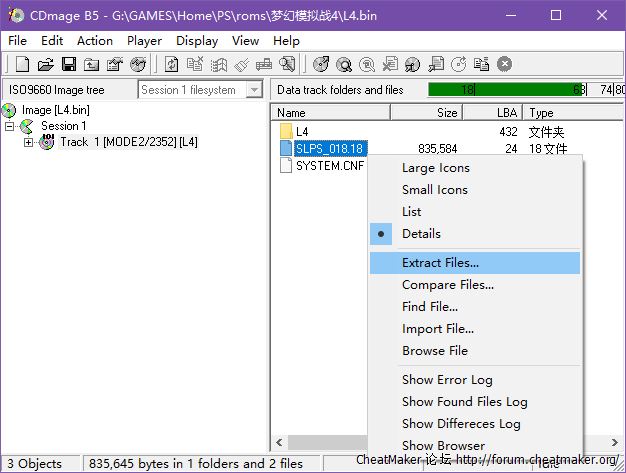 运行CDmage.exe→Open打开bin格式L4镜像(非只读)→选择M2/2352类型打开→左侧点击Track 1→右侧指向"SLPS_018.18"右键菜单点击Extract Files→选择修改器目录并导出。