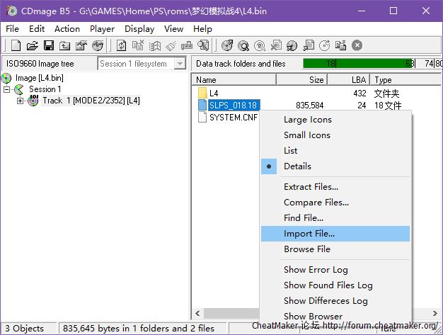3、用CDmage把修改后的"SLPS_018.18"文件导入bin格式L4镜像的根目录(导入前请备份镜像)。