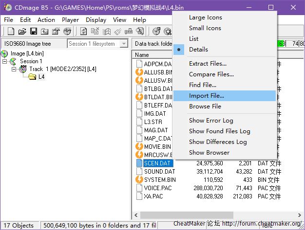 3、用CDmage把修改后的"SCEN.DAT"文件导入bin格式L4镜像的L4目录(导入前请备份镜像)。