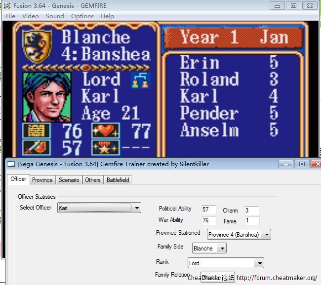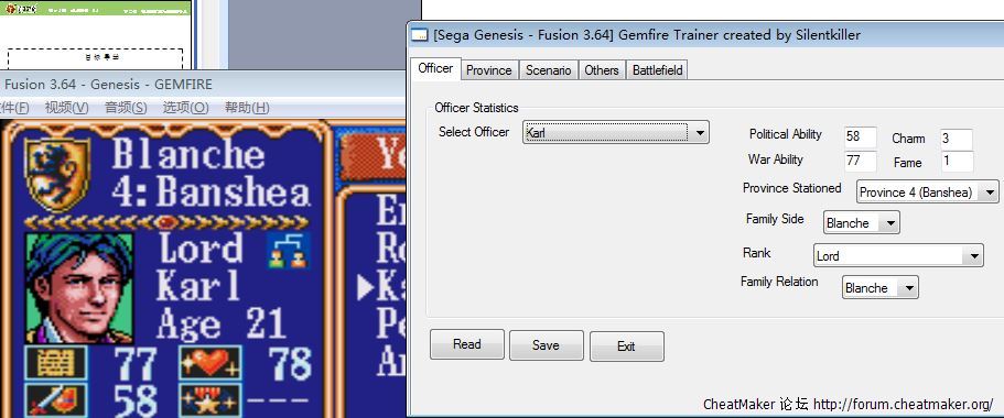 MD版本 Fusion 3.64 模拟器打开的MD皇室血裔 (繁) (永盛),第三个是用dos模拟的皇室血裔从第三个可以得知第二个里的数字代表什么,可它们与silentkiller大大的[MD] 皇家血裔修改器里显示的不同