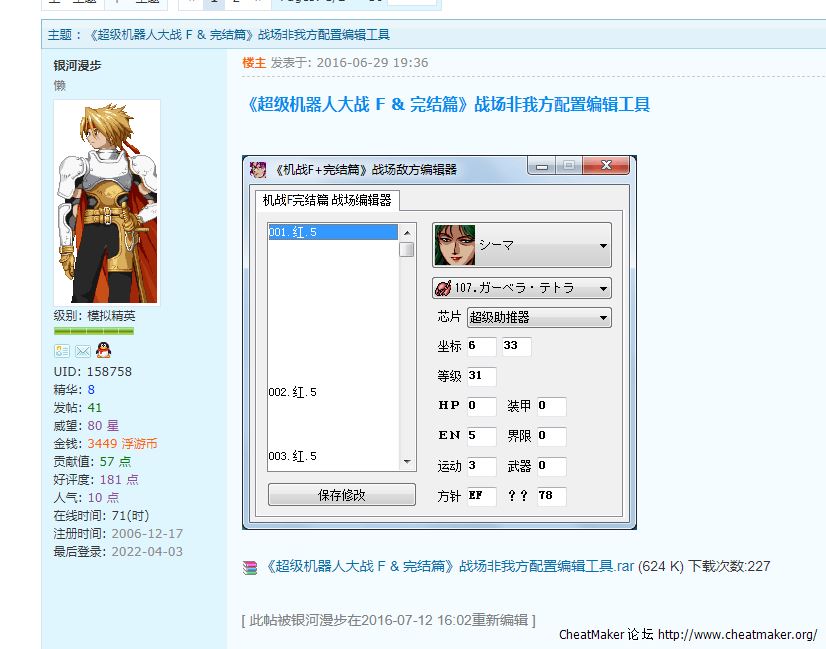 求银河大大制作的超级机器人大战F & 完结篇战场非我方配置编辑工具,浮游城那裡沒邀请注册码不能進去,感謝