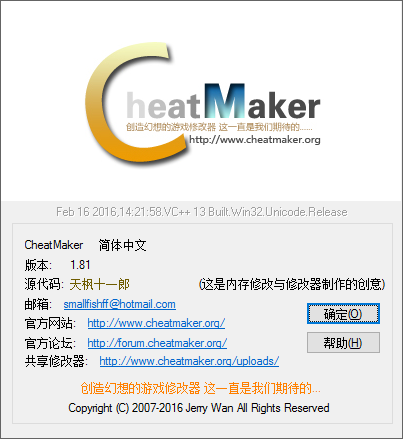 ====================简要说明=============================================================================================== CheatMaker是一个内存修改&游戏修改器制作工具.可以用以修改程序的内存数据及文件数据.它除了具备基本修改器的功能外 最大的特点就是你可以使用它来制作基于任何程序的专用修改器 而且它不但支持直接修改电脑程序/电脑游戏在内存中的数据 并且可以制作运行于模拟器上的电视游戏的修改器.