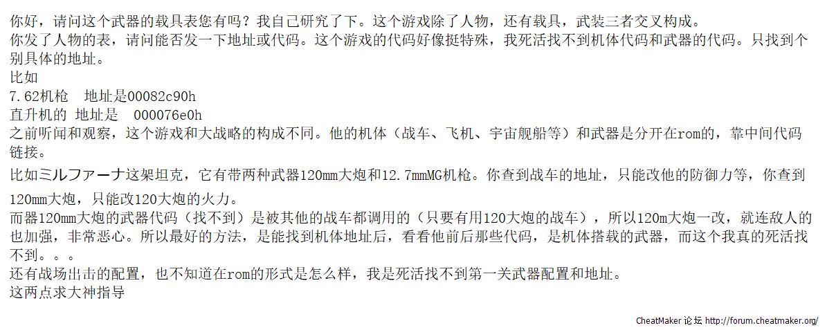 版主您好,请问,md游戏联合前线你发过一些修改材料。我看了。我尝试静态修改的时候,找不到武器的码表,尤其是坦克对应的机枪和大炮这两个码。有人说联合前线比较特殊,这个码是4位数不是常见的2位数,请问是真的吗?请问你有没有码表?因为联合前线的坦克,是坦克几行数据,武器另一组数据,然后坦克加上武器的两个表两两组合出一个坦克的