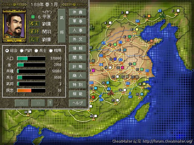 地图表现力,虽然也是纯色在表示势力,但是地图总体效果却在游戏机版之上,特别是城池和关卡的图标,得益于大分辨率得以在地图上直接体现出来。DOS其实是PS版制作的蓝本,但这些好的细节PS版反而没有继承。