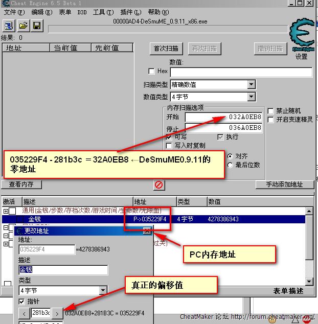游戏HP之类的PC内存地址 - 游戏HP之类真正的偏移值 = 零地址。输入CE的"开始"编辑框。