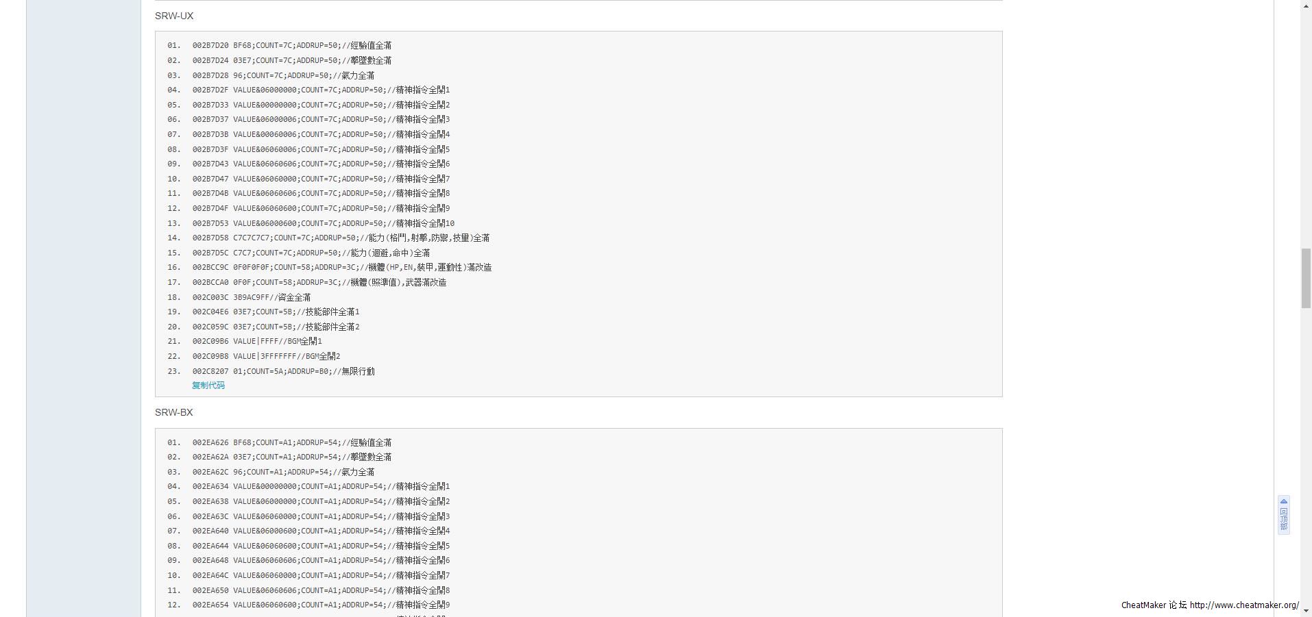 10. 02006DE8 0F0F0F0F;COUNT=96;ADDRUP=70;//機體(HP,EN,裝甲,運動性)滿改造
