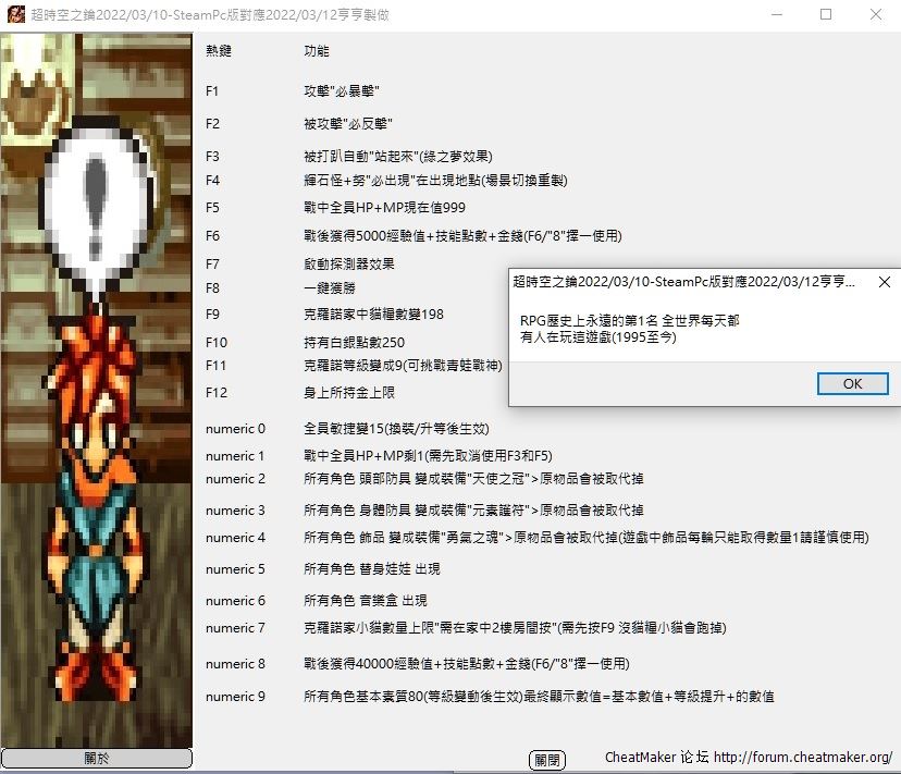 該場所 需機率出現的怪物 必出現場景切換重置>建議到該地點要打該怪時再使用原始>狩獵之森下雨時努必出現中世紀>妖蛙之森的努必出現中世紀>龍之聖域-綠山 >輝石怪出現地點必出現中世紀>龍之聖域-北方森林 >輝石怪出現地點必出現原始>龍之聖域-北方森林>輝石怪出現地點必出現古代>次元扭曲點-跳涯前 >輝石怪出現地點必出現===========================================大師之冠(男專用)全攻擊X1.25倍天使之冠(女專用)指令條加速增加1倍=攻擊輸出多1次=2倍攻擊力勇氣之魂(只能艾拉裝備)50%機率反擊+10%暴擊虹之眼鏡(全員都能裝)=全攻擊X1.5倍所以頭部飾品天使之冠和大師之冠 我最後編程是選擇"天使之冠"而飾品因有的武器暴擊時攻擊力是9999或4倍>最後決定是裝備勇氣之魂