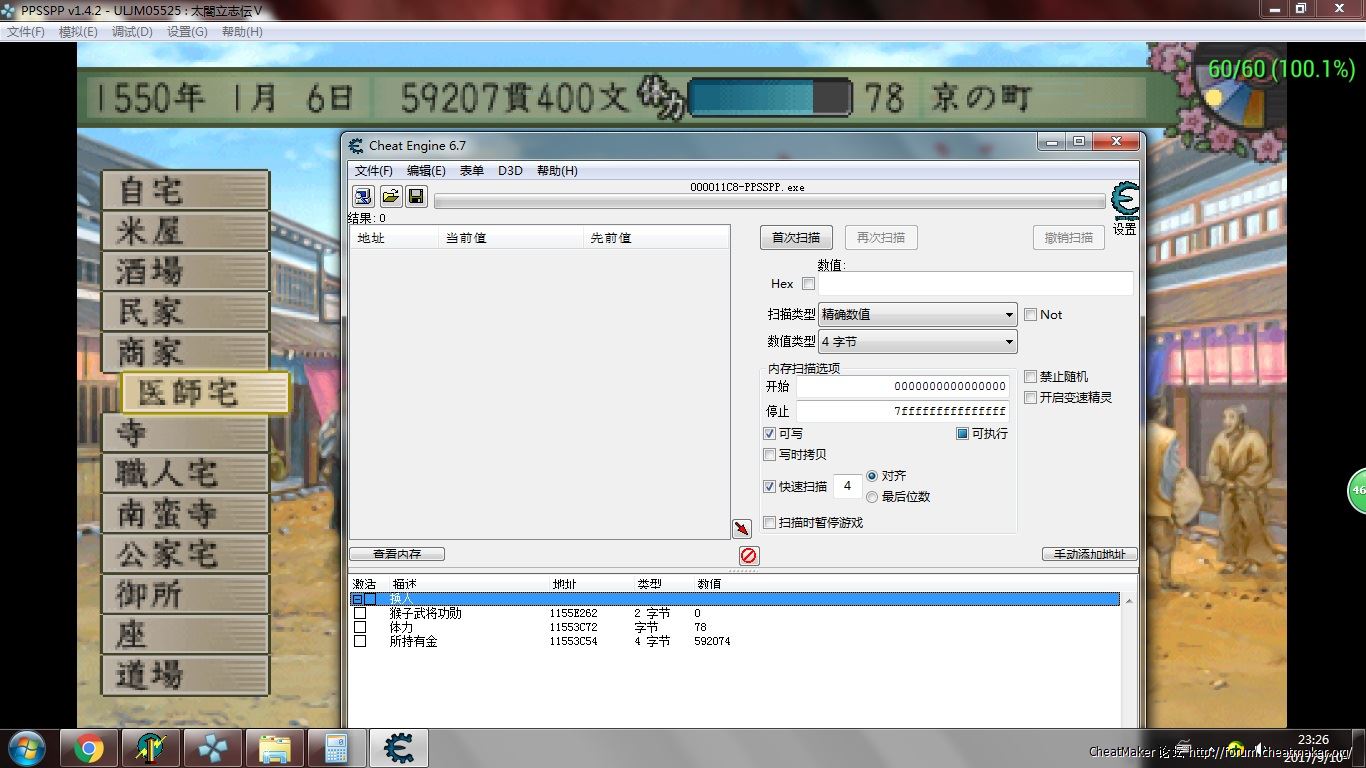 哦,忘了修行1日是PS2版的金手指,不知PSP的缩短修行天数如何通过CE找到内存地址,不知银河大侠能否提供个思路给小弟参考!!!