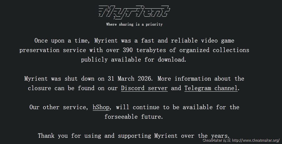 ___ |/ /____ ___________(_)_____________ /___ /|_/ /__ / / /_ ___/_ /_ _ \_ __ \ __/_ / / / _ /_/ /_ / _ / / __/ / / / /_ /_/ /_/ _\__, / /_/ /_/ \___//_/ /_/\__/ /____/ Where sharing is a priorityOnce upon a time, Myrient was a fast and reliable video game preservation service with over 390 terabytes of organized collections publicly available for download.Myrient was shut down on 31 March 2026. More information about the closure can be found on our Discord server and Telegram channel.Our other service, hShop, will continue to be available for the forseeable future.Thank you for using and supporting Myrient over the years.